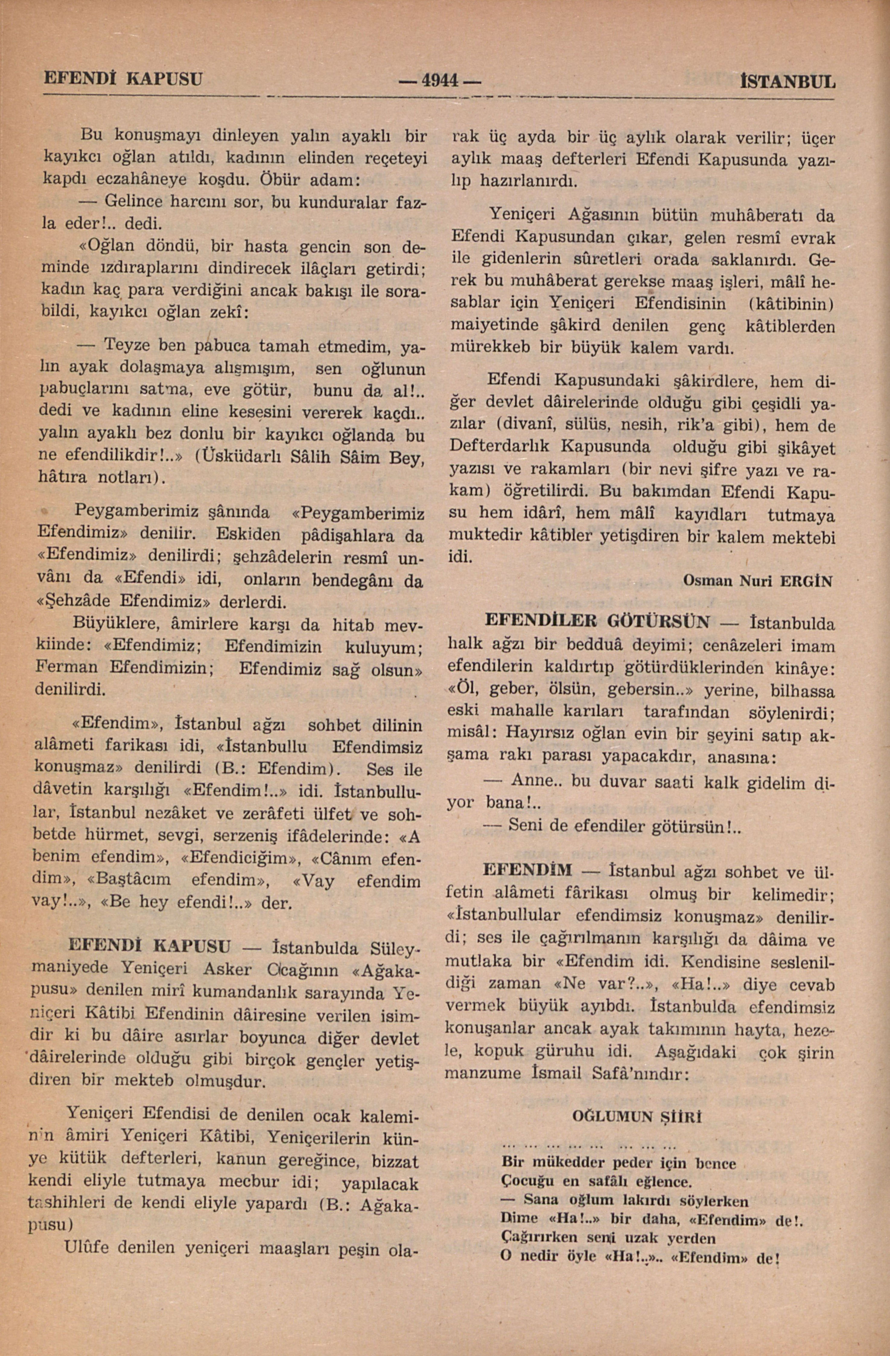 İstanbulda Süleymaniyede Yeniçeri Asker Ocağının “Ağakapusu” denilen mirî kumandanlık sarayında Yeniçeri Kâtibi Efendinin dâiresine verilen isimdir ki bu dâire asırlar boyunca diğer devlet dâirelerinde olduğu gibi birçok gençler yetişdiren bir mekteb olmuşdur. Yeniçeri Efendisi de denilen ocak kaleminin âmiri Yeniçeri Kâtibi, Yeniçerilerin künye kütük defterleri, kanun gereğince, bizzat kendi eliyle tutmaya mecbur idi; yapılacak tashihleri de kendi eliyle yapardı (B.: Ağakapusu) Ulûfe denilen yeniçeri maaşları peşin olarak üç ayda bir üç aylık olarak verilir; üçer aylık maaş defterleri Efendi Kapusunda yazılıp hazırlanırdı. Yeniçeri Ağasının bütün muhâberatı da Efendi Kapusundan çıkar, gelen resmî evrak ile gidenlerin sûretleri orada saklanırdı. Gerek bu muhâberat gerekse maaş işleri, mâlî hesablar için Yeniçeri Efendisinin (kâtibinin) maiyetinde şâkird denilen genç kâtiblerden mürekkeb bir büyük kalem vardı. Efendi Kapusundaki şâkirdlere, hem diğer devlet dâirelerinde olduğu gibi çeşidli yazılar (divanî, sülüs, nesih, rik’a gibi), hem de Defterdarlık Kapusunda olduğu gibi şikâyet yazısı ve rakamları (bir nevi şifre yazı ve rakam) öğretilirdi. Bu bakımdan Efendi Kapusu hem idârî, hem mâlî kayıdları tutmaya muktedir kâtibler yetişdiren bir kalem mektebi idi. Osman Nuri ERGİN