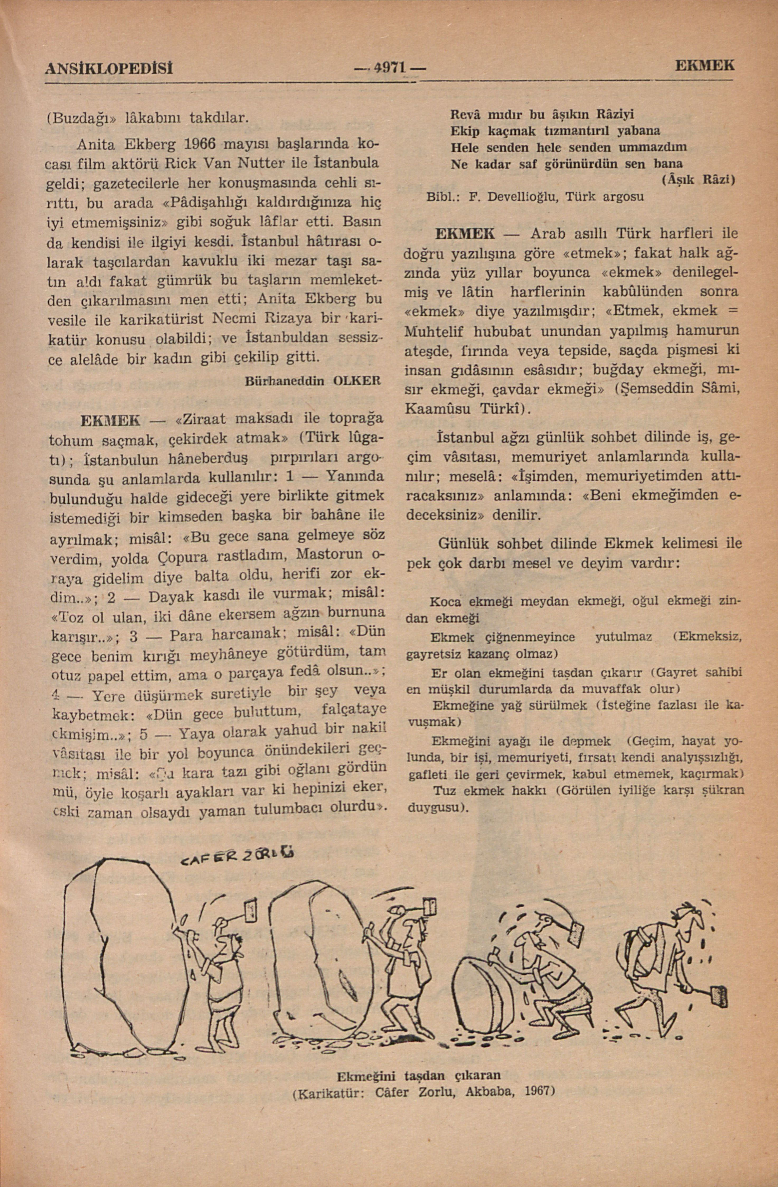 Yüz yıllar boyunca büyük şehir İstanbulun günlük iâşesinde ekmek en başda duran gıda maddesi olagelmişdir; bilhassa fakir halkın yegâne baş ğıdâsı olmuşdur; önce ekmek tedârikine bakılmış, sonra yanına bir katık aranmışdır; aşağıdaki manzûme Ali Ekrem Bolayırındır: