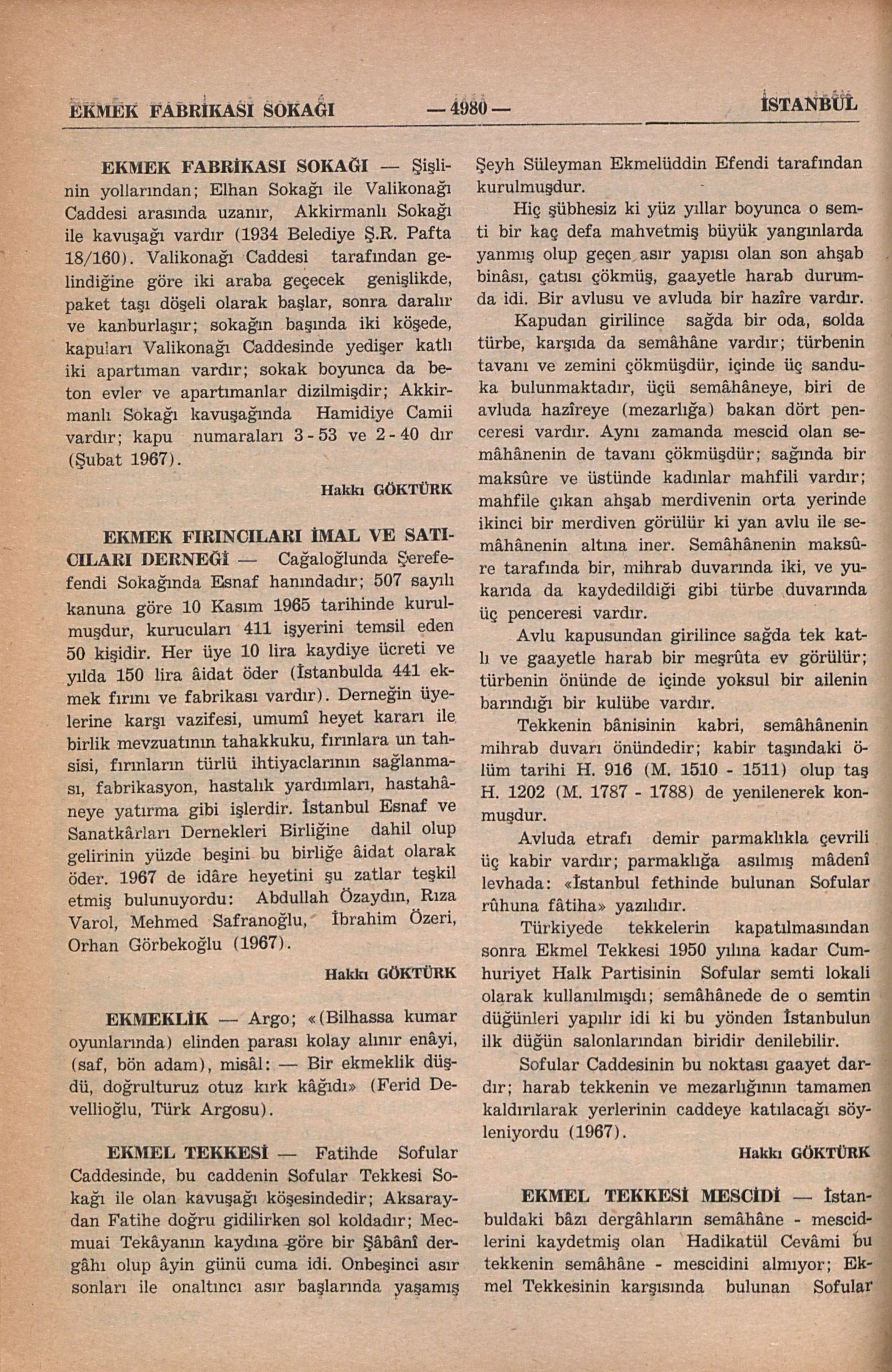 Cağaloğlunda Şerefefendi Sokağında Esnaf hanındadır; 507 sayılı kanuna göre 10 Kasım 1965 tarihinde kurulmuşdur, kurucuları 411 işyerini temsil eden 50 kişidir. Her üye 10 lira kaydiye ücreti ve yılda 150 lira âidat öder (İstanbulda 441 ekmek fırını ve fabrikası vardır). Derneğin üyelerine karşı vazifesi, umumî heyet kararı ile birlik mevzuatının tahakkuku, fırınlara un tahsisi, fırınların türlü ihtiyaclarının sağlanması, fabrikasyon, hastalık yardımları, hastahâneye yatırma gibi işlerdir. İstanbul Esnaf ve Sanatkârları Derneği Birliğine dahil olup gelirinin yüzde beşini bu birliğe âidat olarak öder. 1967 de idâre heyetini şu zatlar teşkil etmiş bulunuyordu: Abdullah Özaydın, Rıza Varol, Mehmed Safranoğlu, İbrahim Özeri, Orhan Görbekoğlu (1967).