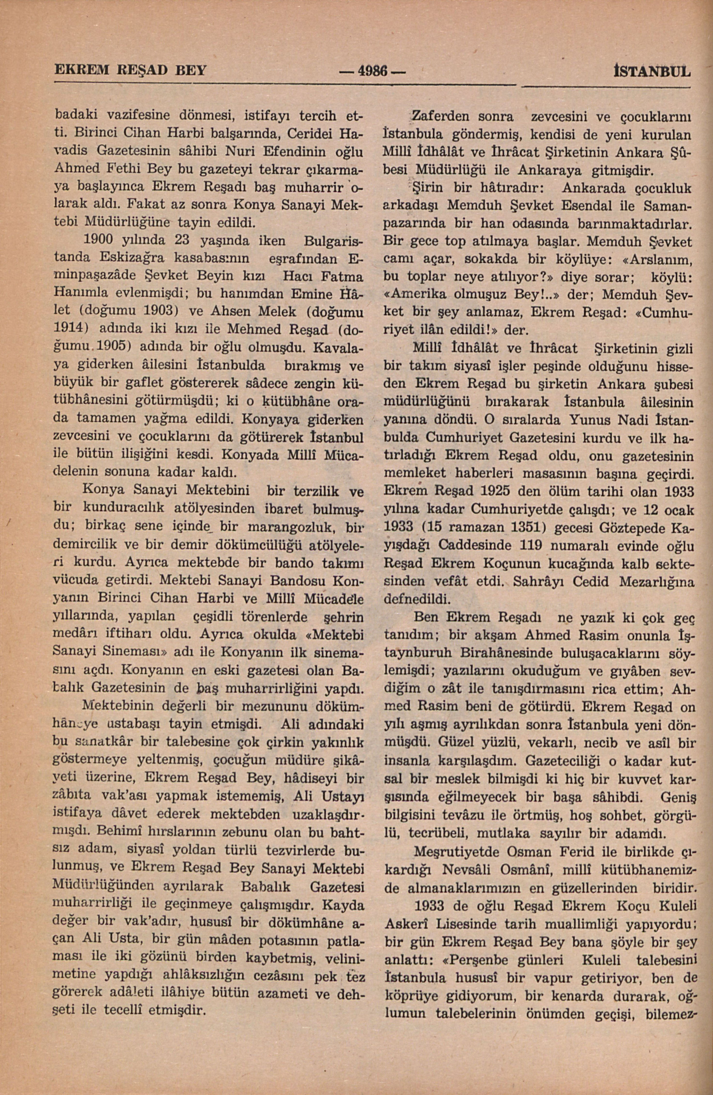 “. . . kalemimi onun için her ele alışımda, aşkım sel gibi iniyor, yazacak yerde ağlıyorum. Ne güzelliğinin, ne fazîletlerinin, ne de iffet ve nâmusunun, ve ne ilmü irfânının vârisi olabildim. Dünyâ misafirliğinde onu övündürecek bir şeyler yapabildim diyemem, her an aczimi idrâk edişim belki rûhunu şâd eder. İstanbul Ansiklopedisini tüm olarak adına ithaf ettiğim babam Ekrem Reşad Beyin hal tercemesini senin kalemine emânet ediyorum. 3 marta 1944. R. E. Koçu”.