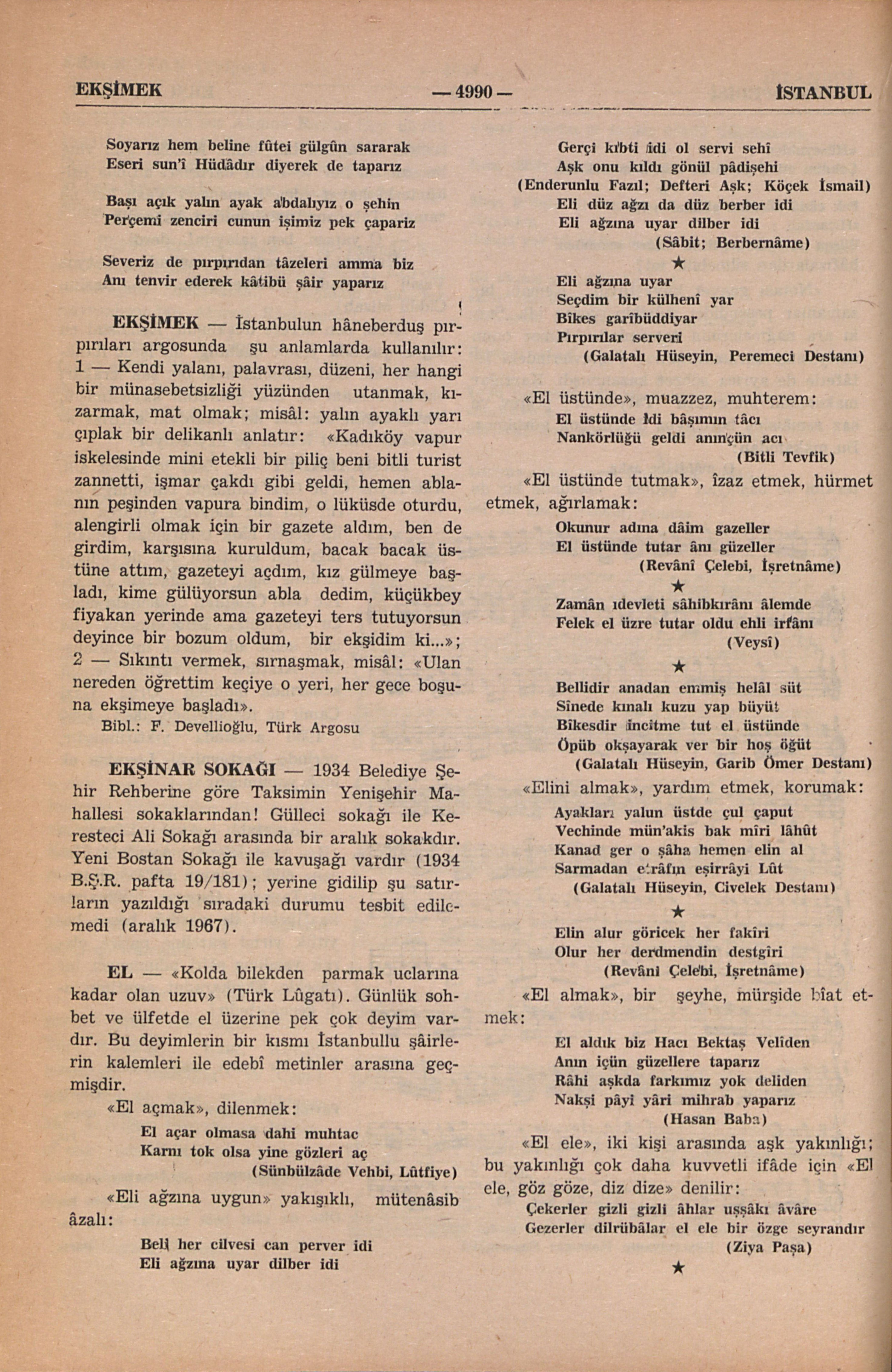 “Kolda bilekden parmak uclarına kadar olan uzuv” (Türk Lûgatı). Günlük sohbet ve ülfetde el üzerine pek çok deyim vardır. Bu deyimlerin bir kısmı İstanbullu şâirlerin kalemleri ile edebî metinler arasına geçmişdir. “El açmak”, dilenmek: El açar olmasa dahi muhtac Karnı tok olsa yine gözleri aç (Sünbülzâde Vehbi, Lûtfiye) “Eli ağzına uygun” yakışıklı, mütenâsib âzalı: Beli her cilvesi can perver idi Eli ağzına uyar dilber idi Gerçi kıbti idi ol servi sehî Aşk onu kıldı gönül pâdişehi (Enderunlu Fazıl; Defteri Aşk; Köçek İsmail) Eli düz ağzı da düz berber idi Eli ağzına uyar dilber idi (Sâbit: Berbernâme) * Eli ağzına uyar Seçdim bir külhenî yar Bîkes garîbüddiyar Pırpırılar serveri (Galatalı Hüseyin, Peremeci Destanı) “El üstünde”, muazzez, muhterem: El üstünde idi bâşımın tâcı Nankörlüğü geldi anınçün acı (Bitli Tevfik) “El üstünde tutmak”, îzaz etmek, hürmet etmek, ağırlamak: Okunur adına dâim gazeller El üstünde tutar ânı güzeller (Revânî Çelebi, İşretnâme) * Zamân ıdevleti sâhibkırânı âlemde Felek el üzre tutar oldu ehli irfânı (Veysî) * Bellidir anadan emmiş helâl süt Sinede kınalı kuzu yap büyüt Bilkesdir incitme tut el üstünde Öpüb okşayarak ver bir hoş öğüt (Galatalı Hüseyin, Garib Ömer Destanı) “Elini almak”, yardım etmek, korumak: Ayakları yalun ü...