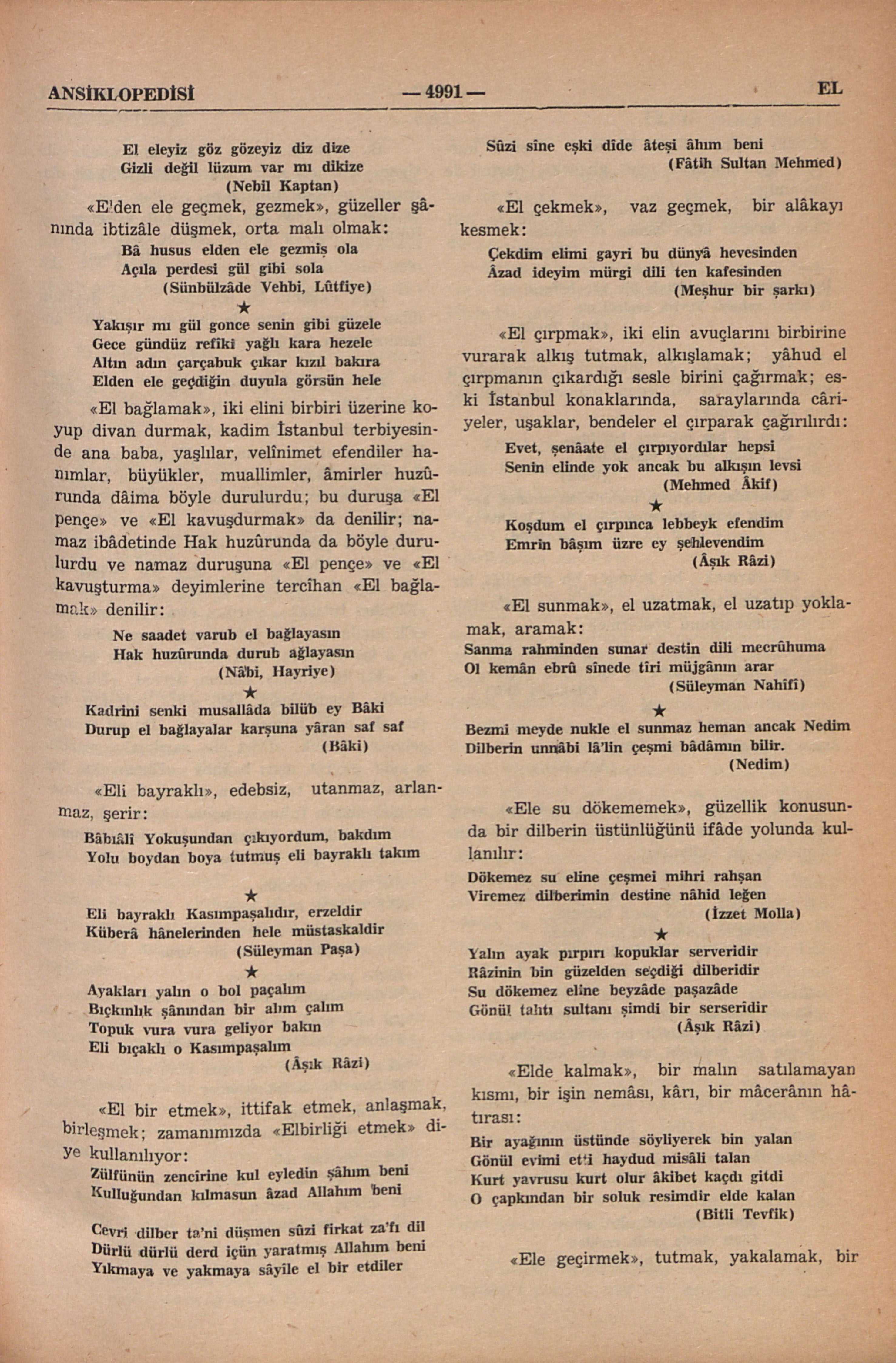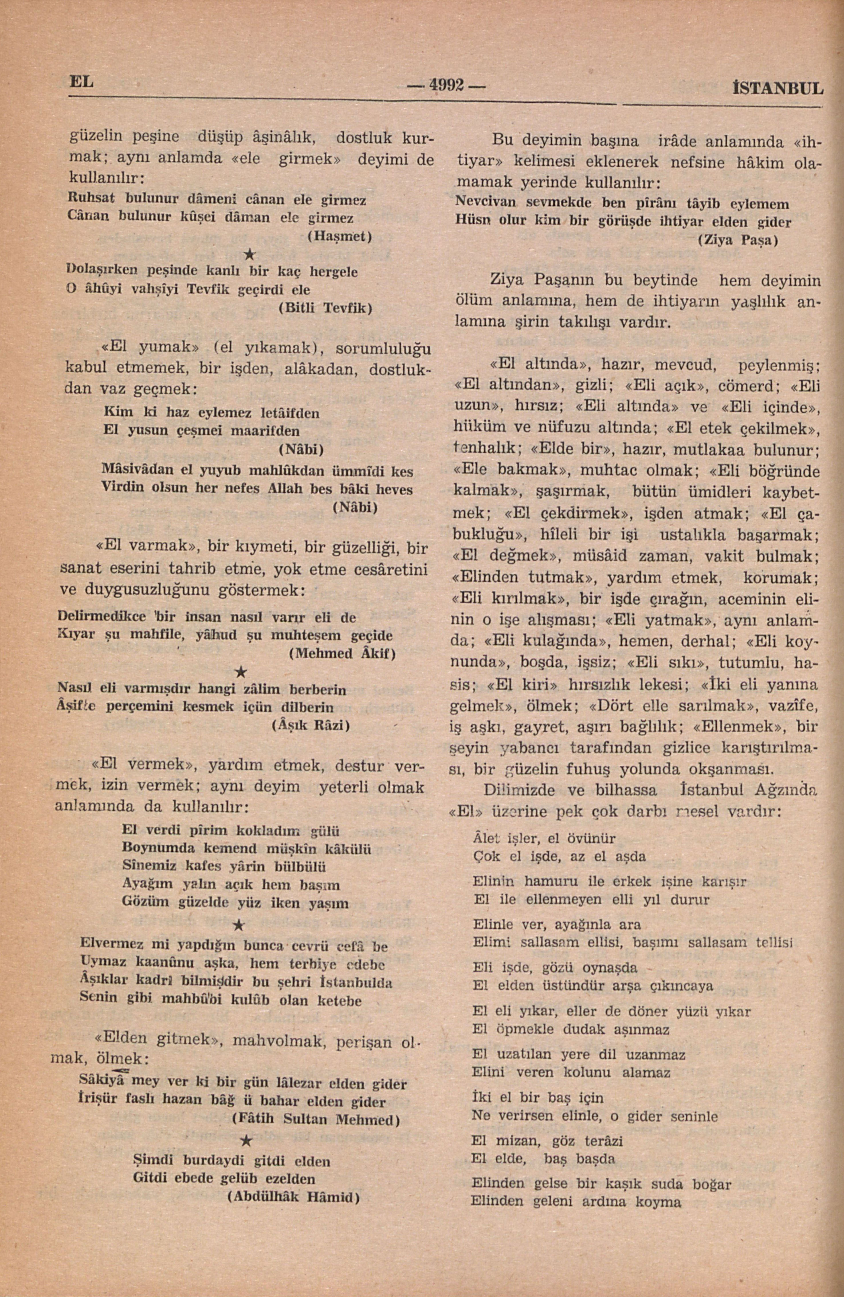 “Kolda bilekden parmak uclarına kadar olan uzuv” (Türk Lûgatı). Günlük sohbet ve ülfetde el üzerine pek çok deyim vardır. Bu deyimlerin bir kısmı İstanbullu şâirlerin kalemleri ile edebî metinler arasına geçmişdir. “El açmak”, dilenmek: El açar olmasa dahi muhtac Karnı tok olsa yine gözleri aç (Sünbülzâde Vehbi, Lûtfiye) “Eli ağzına uygun” yakışıklı, mütenâsib âzalı: Beli her cilvesi can perver idi Eli ağzına uyar dilber idi Gerçi kıbti idi ol servi sehî Aşk onu kıldı gönül pâdişehi (Enderunlu Fazıl; Defteri Aşk; Köçek İsmail) Eli düz ağzı da düz berber idi Eli ağzına uyar dilber idi (Sâbit: Berbernâme) * Eli ağzına uyar Seçdim bir külhenî yar Bîkes garîbüddiyar Pırpırılar serveri (Galatalı Hüseyin, Peremeci Destanı) “El üstünde”, muazzez, muhterem: El üstünde idi bâşımın tâcı Nankörlüğü geldi anınçün acı (Bitli Tevfik) “El üstünde tutmak”, îzaz etmek, hürmet etmek, ağırlamak: Okunur adına dâim gazeller El üstünde tutar ânı güzeller (Revânî Çelebi, İşretnâme) * Zamân ıdevleti sâhibkırânı âlemde Felek el üzre tutar oldu ehli irfânı (Veysî) * Bellidir anadan emmiş helâl süt Sinede kınalı kuzu yap büyüt Bilkesdir incitme tut el üstünde Öpüb okşayarak ver bir hoş öğüt (Galatalı Hüseyin, Garib Ömer Destanı) “Elini almak”, yardım etmek, korumak: Ayakları yalun üstde çul çaput Vechinde mün’akis bak mîri lâhût Kanad ger o şâha hemen elin al Sarmadan etrâfın eşirrâyi Lût (Galatalı Hüseyin, Civelek Destanı) * Elin alur göricek her fakîri Olur her derdmendin destgîri (Revâni Çelebi, İşretnâneme) “El almak”, bir şeyhe, mürşide bîat etmek: El aldık biz Hacı Bektaş Velîden Anın içün güzellere taparız Râhi aşkda farkımız yok deliden Nakşi pâyi yâri mihrab yaparız (Hasan Baba) “El ele”, iki kişi arasında aşk yakınlığı; bu yakınlığı çok daha kuvvetli ifâde için “El ele, göz göze, diz dize” denilir: Çekerler gizli gizli âhlar uşşâkı âvâre Gezerler dilrübâlar el ele bir özge seyrandır (Ziya Paşa) * El eleyiz göz gözeyiz diz dize Gizli değil lüzum var mı dikize (Nebil Kaptan) “Elden ele geçmek, gezmek”, güzeller şânında ibtizâle düşmek, orta malı olmak: Bâ husus elden ele gezmiş ola Açıla perdesi gül gibi sola (Sünbülzâde Vehbi, Lûtfiye) * Yakışır mı gül gonce senin gibi güzele Gece gündüz refîki yağlı kara hezele Altın adın çarçabuk çıkar kızıl bakıra Elden ele geçdiğin duyula görsün hele “El bağlamak”, iki elini birbiri üzerine koyup divan durmak, kadim İstanbul terbiyesinde ana baba, yaşlılar, velinimet efendiler hanımlar, büyükler, muallimler, âmirler huzûrunda dâima böyle durulurdu; bu duruşa “El pençe” ve “El kavuşdurmak” da denilir; namaz ibâdetinde Hak huzûrunda da böyle durulurdu ve namaz duruşuna “El pençe” ve “El kavuşturma” deyimlerine tercihan “El bağlamak” denilir: Ne saadet varub el bağlayasın Hak huzûrunda durub ağlayasın (Nâbi, Hayriye) * Kadrini senki musallâda billüb ey Bâki Durup el bağlayalar karşuna yâran saf saf (Bâki) “Eli bayraklı”, edebsiz, utanmaz, arlanmaz, şerir: Bâbıâlî Yokuşundan çıkıyordum, bakdım Yolu boydan boya tutmuş eli bayraklı takım * Eli bayraklı Kasımpaşalıdır, erzeldir Küberâ hânelerinden hele müstaskaldir (Süleyman Paşa) * Ayakları yalın o bol paçalım Bıçkınlık şânından bir alım çalım Topuk vura vura geliyor bakın Eli bıçaklı o Kasımpaşalının (Âşık Râzi) “El bir etmek”, ittifak etmek, anlaşmak, birleşmek; zamanımızda “Elbirliği etmek” diye kullanılıyor: Zülfünün zencirine kul eyledin şâhım beni Kulluğundan kılmasun âzad Allahım beni Cevri dilber tâ’ni düşmen sûzi firkat za’fı dil Dürlü dürlü derd içün yaratmış Allahım beni Yıkmaya ve yakmaya sâyîle el bir etdiler Sûzi sîne eşki dîde âteşi âhım beni (Fâtih Sultan Mehmed) “El çekmek”, vaz geçmek, bir alâkayı kesmek: Çekdim elimi gayri bu dünyâ hevesinden Âzad ideyim mürgi dili ten kafesinden (Meşhur bir şarkı) “El çırpmak”, iki elin avuçlarını birbirine vurarak alkış tutmak, alkışlamak; yâhud el çırpmanın çıkardığı sesle birini çağırmak; eski İstanbul konaklarında, saraylarında câriyeler, uşaklar, bendeler el çırparak çağırılırdı: Evet, şenâate el çırpıyordılar hepsi Senin elinde yok ancak bu alkışın levsi (Mehmed Âkif) * Koşdum el çırpınca lebbeyk efendim Emrim bâşım üzre ey şehlevendim (Âşık Râzi) “El sunmak”, el uzatmak, el uzatıp yoklamak, aramak: Sanma rahminden sunar destin dili mecrûhuma Ol kemân ebrû sînede tîri müjgânın arar (Süleyman Nahîfî) * Bezmi meyde nukle el sunmaz heman ancak Nedim Dilberin unnâbi lâ’lin çeşmi bâdâmın bilir (Nedim) “Ele su dökememek”, güzellik konusunda bir dilberin üstünlüğünü ifâde yolunda kullanılır: Dökemez su eline çeşmei mihri rahşan Viremez dilberimin destine nâhid leğen (İzzet Molla) * Yalın ayak pırpırı kopuklar serveridir Râzinin bin güzelden seçdiği dilberidir Su dökemez eline beyzâde paşazâde Gönül tahtı sultan şimdi bir serserîdir (Âşık Râzi) “Elde kalmak”, bir malın satılamayan kısmı, bir işin nemâsı, kârı, bir mâcerânın hâtırası: Bir ayağının üstünde söyliyerek bin yalan Gönül evimi etti haydud misâli talan Kurt yavurusu kurt olur âkibet kaçdı gitdi O çapkından bir soluk resimdir elde kalan (Bitli Tevfik) “Ele geçirmek”, tutmak, yakalamak, bir güzelin peşine düşüp âşinâlık, dostluk kurmak; aynı anlamda “ele girmek” deyimi de kullanılır: Ruhsat bulunur dâmeni cânan ele girmez Cânan bulunur kûşei dâman ele girmez (Haşmet) * Dolaşırken peşinde kanlı bir kaç hergele O âhûyi vahşîyi Tevfik ge