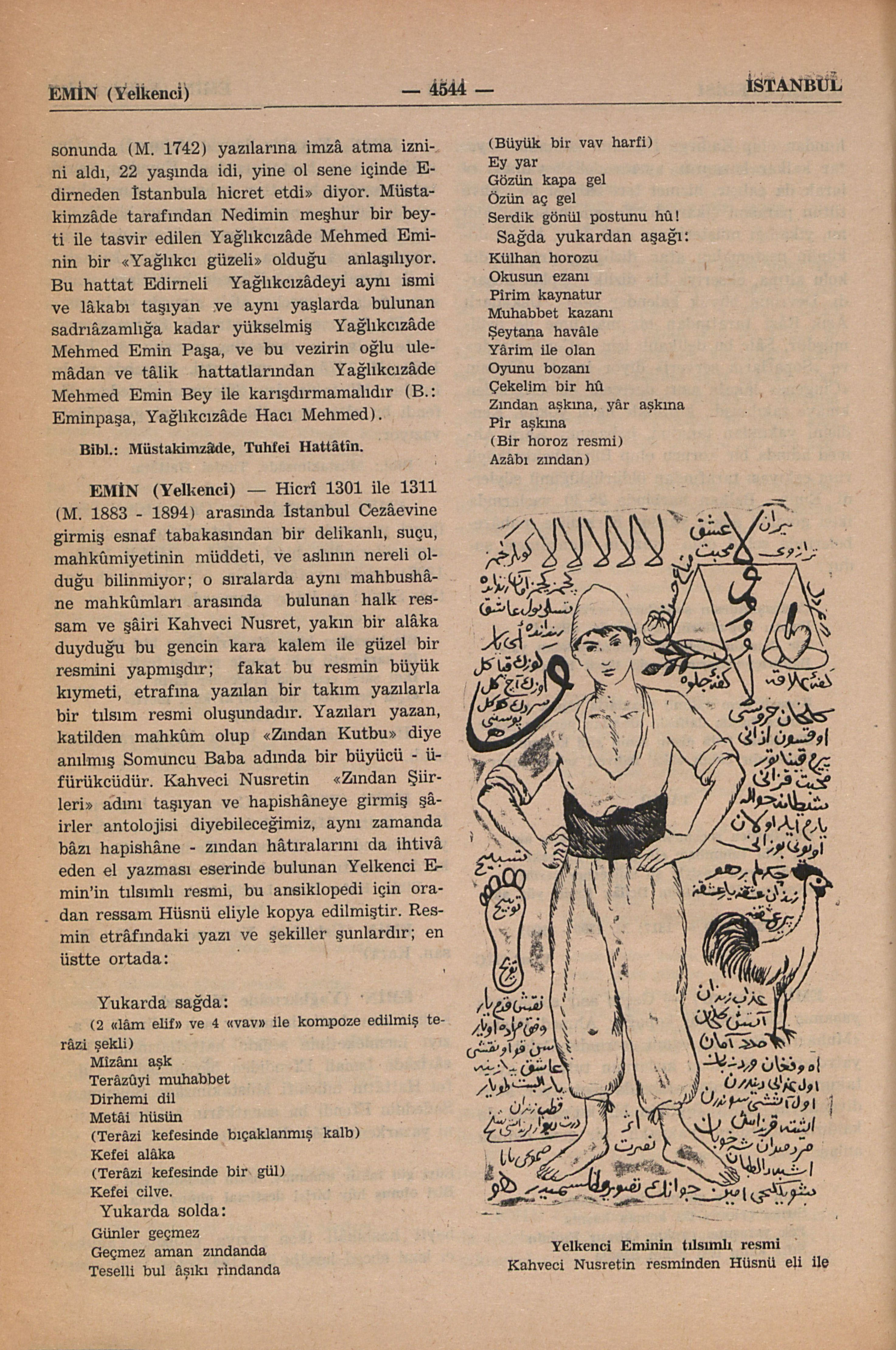 Hicrî 1301 ile 1311 (M. 1883 - 1894) arasında İstanbul Cezâevine girmiş esnaf tabakasından bir delikanlı, suçu, mahkûmiyetinin müddeti, ve aslının nereli olduğu bilinmiyor; o sıralarda aynı mahbushâne mahkûmları arasında bulunan halk ressam ve şâiri Kahveci Nusret, yakın bir alâka duyduğu bu gencin kara kalem ile güzel bir resmini yapmışdır; fakat bu resmin büyük kıymeti, etrafına yazılan bir takım yazılarla bir tılsım resmi oluşundadır. Yazıları yazan, katilden mahkûm olup “Zından Kutbu” diye anılmış Somuncu Baba adında bir büyücü - üfürükcüdür. Kahveci Nusretin “Zından Şiirleri” adını taşıyan ve hapishâneye girmiş şâirler antolojisi diyebileceğimiz, aynı zamanda bâzı hapishâne - zından hâtıralarını da ihtivâ eden el yazması eserinde bulunan Yelkenci Emin’in tılsımlı resmi, bu ansiklopedi için oradan ressam Hüsnü eliyle kopya edilmiştir. Resmin etrâfındaki yazı ve şekiller şunlardır; en üstte ortada: