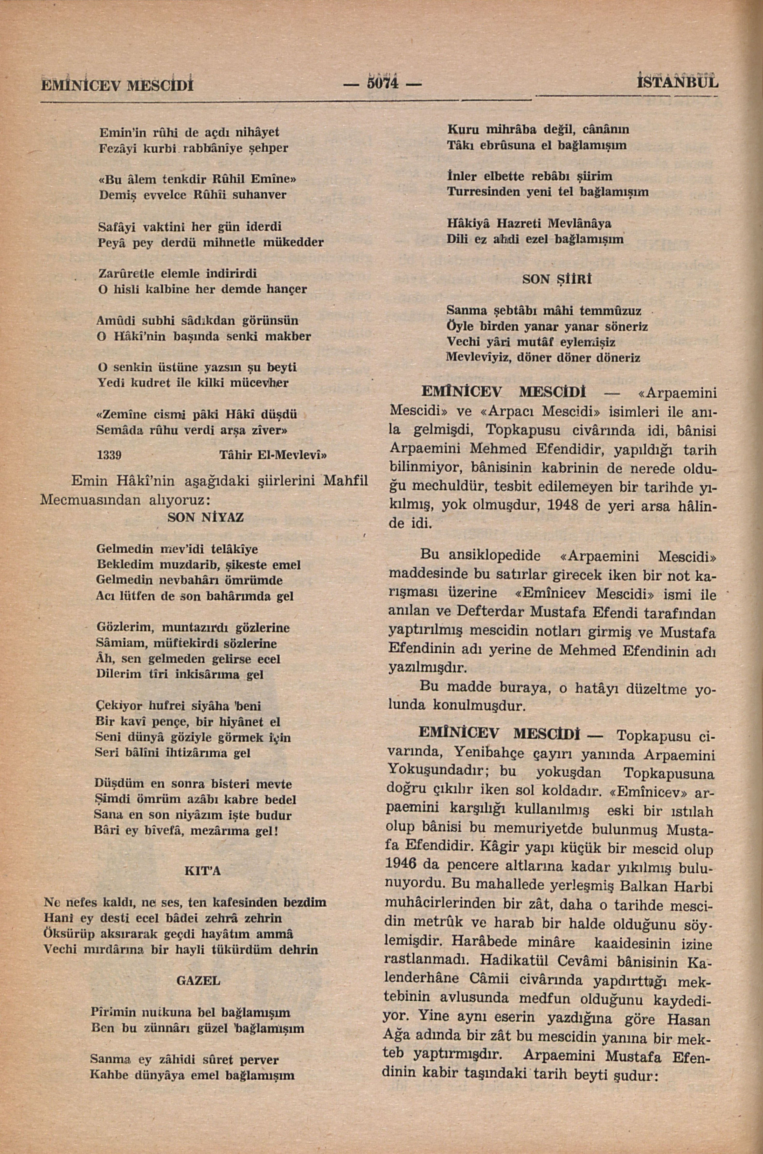 Topkapusu civarında, Yenibahçe çayırı yanında Arpaemini Yokuşundadır; bu yokuşdan Topkapusuna doğru çıkılır iken sol koldadır. “Emînicev” arpaemini karşılığı kullanılmış eski bir ıstılah olup bânisi bu memuriyetde bulunmuş Mustafa Efendidir. Kâgir yapı küçük bir mescid olup 1946 da pencere altlarına kadar yıkılmış bulunuyordu. Bu mahallede yerleşmiş Balkan Harbi muhâcirlerinden bir zât, daha o tarihde mescidin metrûk ve harab bir halde olduğunu söylemişdir. Harâbede minâre kaaidesinin izine rastlanmadı. Hadikatül Cevâmi bânisinin Kalenderhâne Câmii civârında yapdırttığı mektebinin avlusunda medfun olduğunu kaydediyor. Yine aynı eserin yazdığına göre Hasan Ağa adında bir zât bu mescidin yanına bir mekteb yaptırmışdır. Arpaemini Mustafa Efendinin kabir taşındaki tarih beyti şudur: