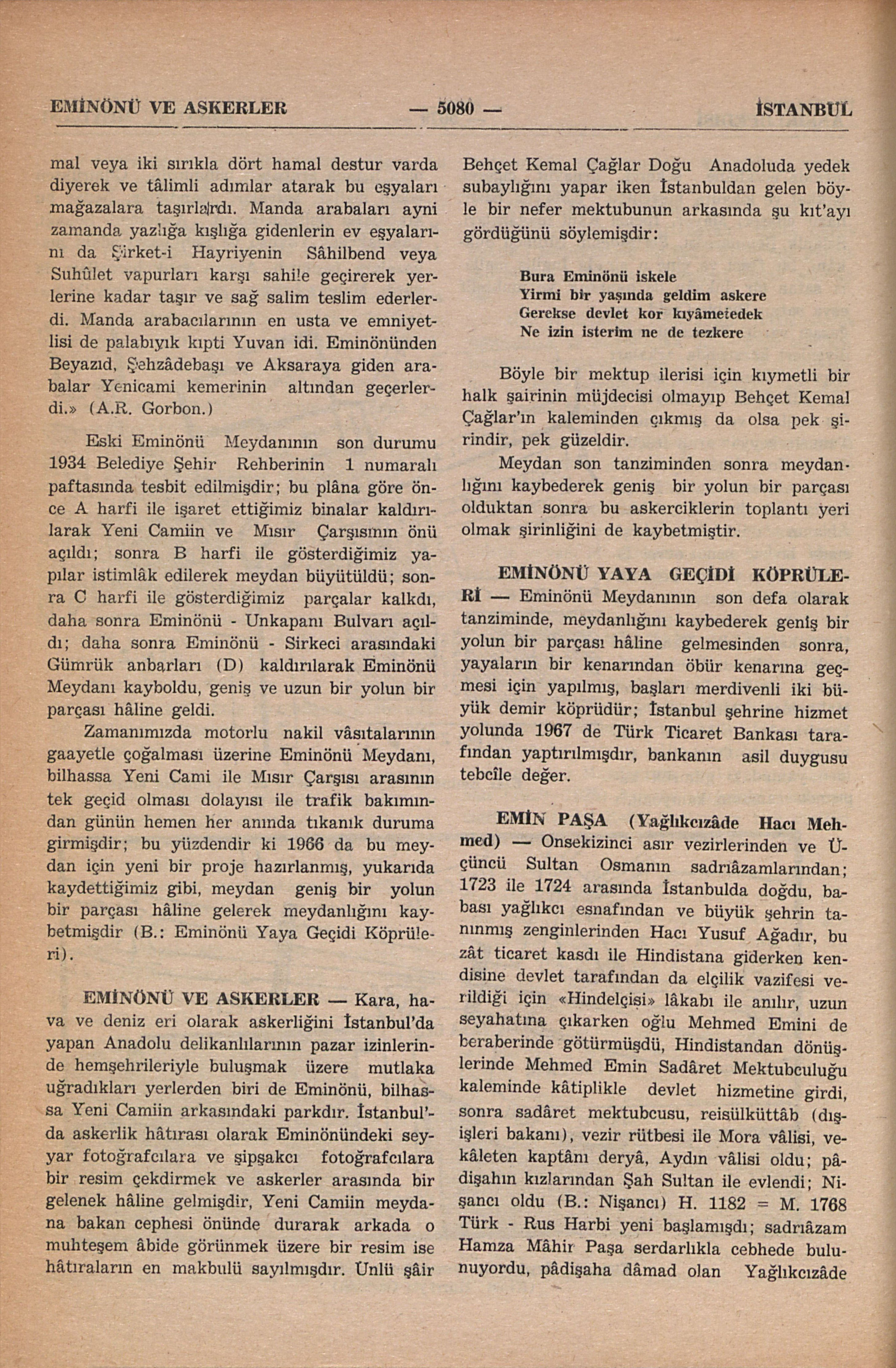 Zamanımızda eski manzarasını, hattâ on yıl önceki manzarasını tamamen kaybetmişdir; büyük küçük, bir meydan çevresi vardır, Eminönü Meydanı çevresini kaybetmiş, bir acâyib sâha, geniş bir yolun bir parçası hâline gelmişdir.