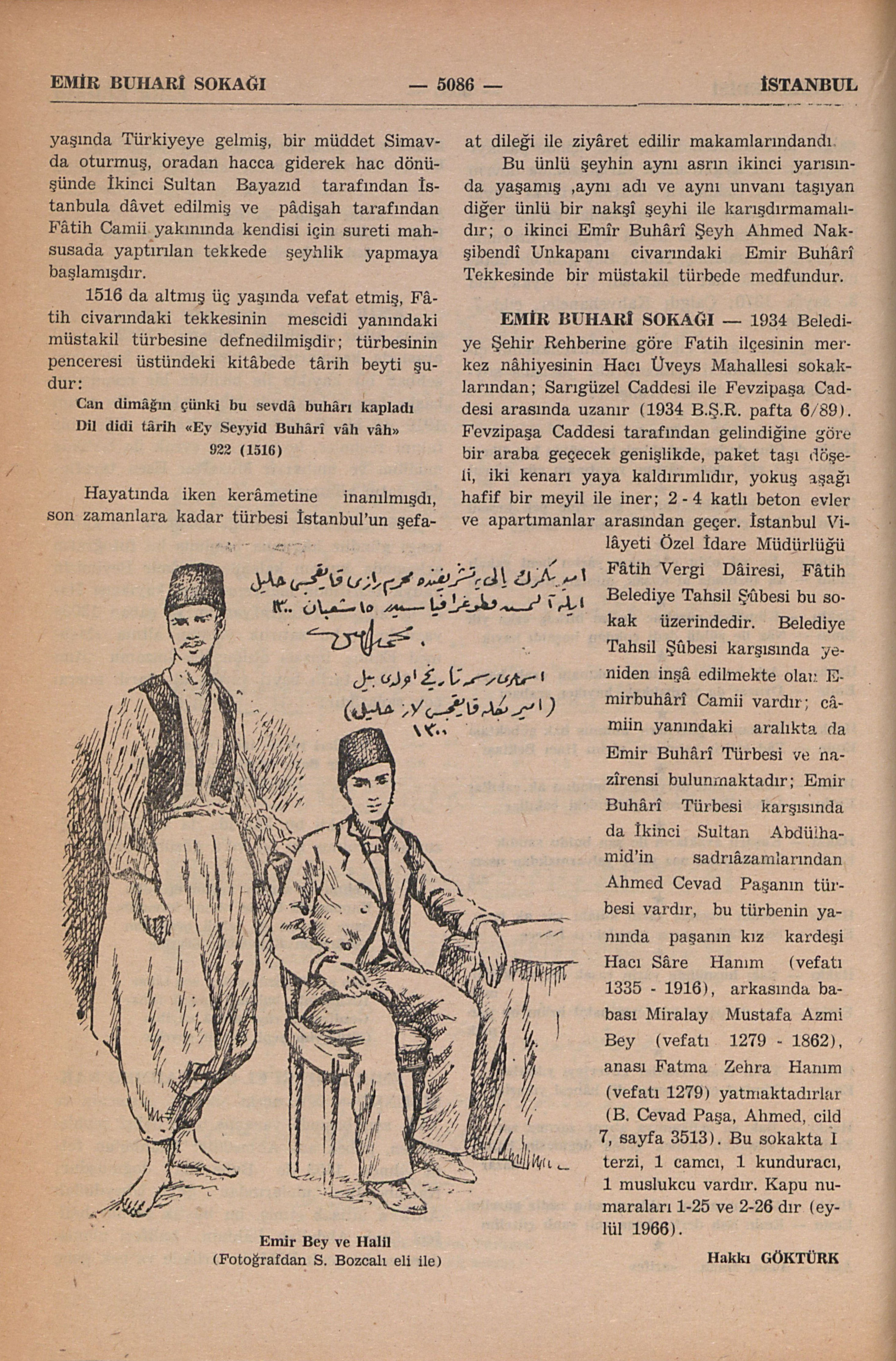 1934 Belediye Şehir Rehberine göre Fatih ilçesinin merkez nâhiyesinin Hacı Üveys Mahallesi sokaklarından; Sarıgüzel Caddesi ile Fevzipaşa Caddesi arasında uzanır (1934 B.Ş.R: pafta 6/89). Fevzipaşa Caddesi tarafından gelindiğine göre bir araba geçecek genişlikde, paket taşı döşeli, iki kenarı yaya kaldırımldır, yokuş aşağı hafif ve meyil ile iner; 2 - 4 katlı beton evler apartımanlar arasından geçer. İstanbul Vilâyeti Özel İdare Müdürlüğü Fâtih Vergi Dâiresi, Fâtih Belediye Tahsil Şûbesi bu sokak üzerindedir. Belediye Tahsil Şûbesi karşısında yeniden inşâ edilmekte olan Emirbuhârî Camii vardır; câmiin yanındaki aralıkta da Emir Buhârî Türbesi ve hazîresi bulunmaktadır; Emir Buhârî Türbesi karşısında da İkinci Sultan Abdülhamid’in sadrıâzamlarından Ahmed Cevad Paşanın türbesi vardır, bu türbenin yanında paşanın kız kardeşi Hacı Sâre Hanım (vefatı 1335 - 1916), arkasında babası Miralay Mustafa Azmi Bey (vefatı 1279 - 1862), anası Fatma Zehra Hanım (vefatı 1279) yatmaktadırlar (B. Cevad Paşa, Ahmed, cild 7, sayfa 3513). Bu sokakta 1 terzi, 1 camcı, 1 kunduracı, 1 muslukcu vardır. Kapu numaraları 1-25 ve 2-26 dır (eylül 1966). Hakkı GÖKTÜRK