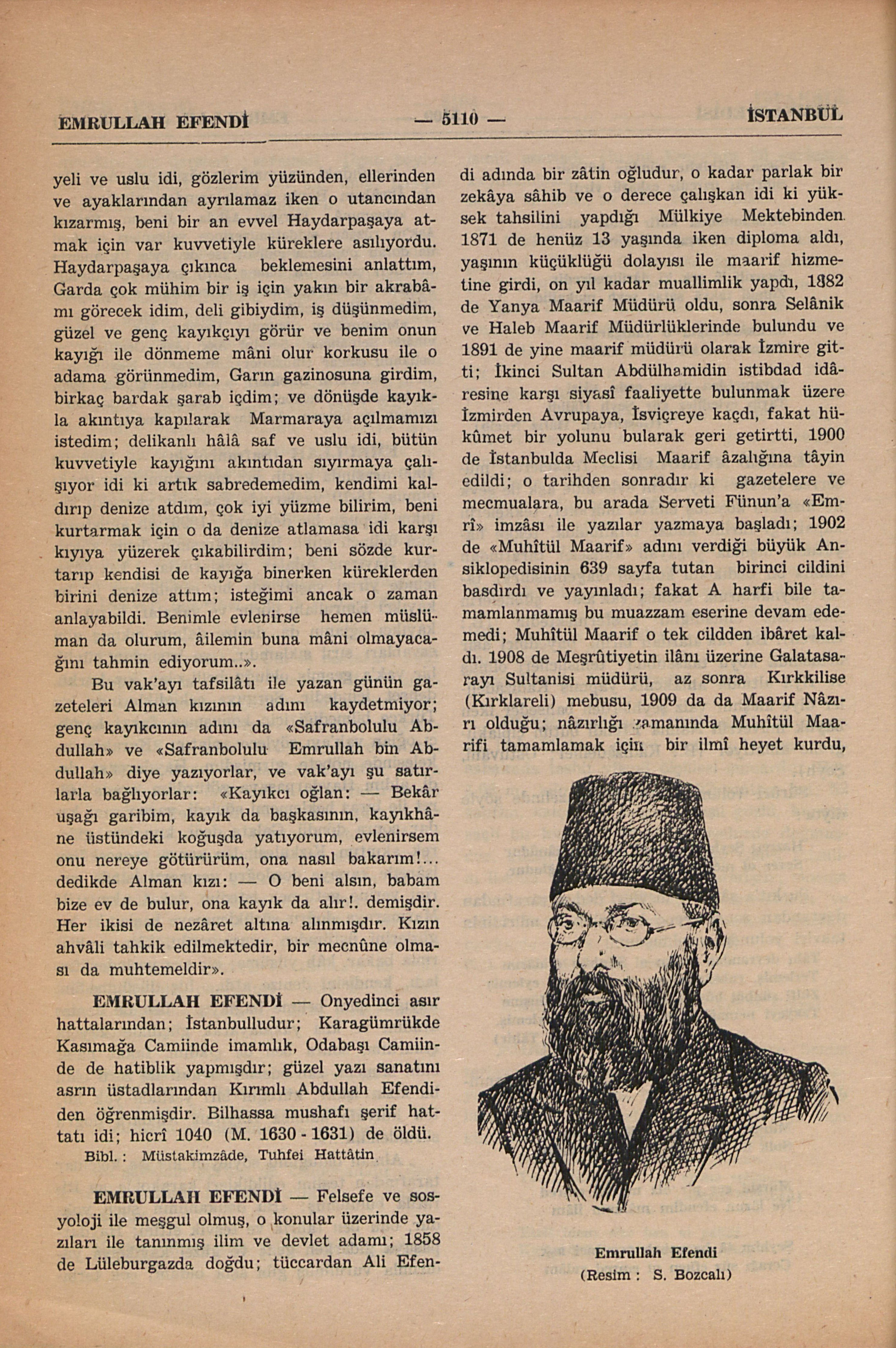 Felsefe ve sosyoloji ile meşgul olmuş, o konular üzerinde yazıları ile tanınmış ilim ve devlet adamı; 1858 de Lüleburgazda doğdu; tüccardan Ali Efendi adında bir zâtin oğludur, o kadar parlak bir zekâya sâhib ve o derece çalışkan idi ki yüksek tahsilini yapdığı Mülkiye Mektebinden 1871 de henüz 13 yaşında iken diploma aldı, yaşının küçüklüğü dolayısı ile maarif hizmetine girdi, on yıl kadar muallimlik yapdı, 1882 de Yanya Maarif Müdürü oldu, sonra Selânik ve Haleb Maarif Müdürlüklerinde bulundu ve 1891 de yine maarif müdürü olarak İzmire gitti; İkinci Sultan Abdülhamidin istibdad idâresine karşı siyasî faaliyette bulunmak üzere İzmirden Avrupaya, İsviçreye kaçdı, fakat hükûmet bir yolunu bularak geri getirtti, 1900 de istanbulda Meclisi Maarif âzalığına tâyin edildi; o tarihden sonradır ki gazetelere ve mecmualara, bu arada Serveti Fünun’a “Emrî” imzâsı ile yazılar yazmaya başladı; 1902 de “Muhîtül Maarif” adını verdiği büyük Ansiklopedisinin 639 sayfa tutan birinci cildini basdırdı ve yayınladı; fakat A harfi bile tamamlanmamış bu muazzam eserine devam edemedi; Muhîtül Maarif o tek cildden ibâret kaldı. 1908 de Meşrûtiyetin ilânı üzerine Galatasarayı Sultanisi müdürü, az sonra Kırkkilise (Kırklareli) mebusu, 1909 da da Maarif Nâzırı olduğu; nâzırlığı zamanında Muhîtül Maarifi tamamlamak için bir ilmî heyet kurdu, kendi başkanlığında toplanan bu heyet, ufak tâdillerle eserin yine o birinci cildinin ikinci baskısını yapdırdı. Kabinenin değişmesi; Emrullah Efendinin nâzırlıkdan ayrılması üzere Muhîtül Maarif için kurduğu heyet de dağıldı; 1911 de Said Halim Paşa kabinesinde ikinci defa maarif nâzırı oldu; bu nâzırlığında maarife en büyük hizmeti Sultanî mekteblerinin (liselerin) programına felsefe ve içtimaiyat (sosyoloji) derslerini koydurtmuş olmasıdır. Bir ara İstanbul Darülfünununda da felsefe dersleri verdi. Talebelerinin elinde kalmış ders notları derin ve geniş bilgisini pek aydın gösterir. 1914 de 56 yaşında Yeşilköydeki evinde kalb sektesinden vefat etti, Fâtih Camii hazîresine defnedildi.