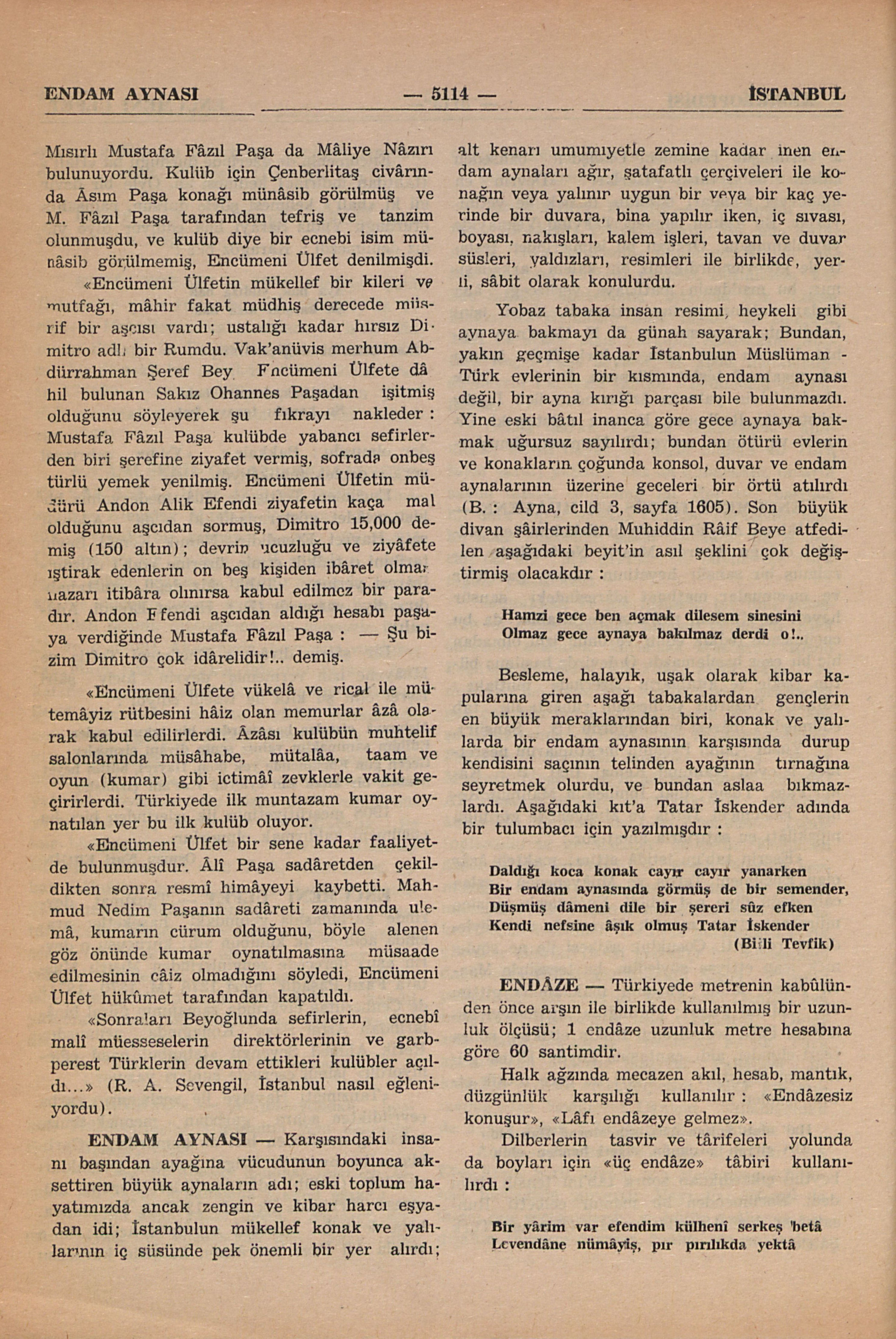 Karşısındaki insanı başından ayağına vücudunun boyunca aksettiren büyük aynaların adı; eski toplum hayatımızda ancak zengin ve kibar harcı eşyadan idi; İstanbulun mükellef konak ve yalılarının iç süsünde pek önemli bir yer alırdı; alt kenarı umumiyetle zemine kadar men endam aynaları ağır, şatafatlı çerçiveleri ile konağın veya yalının uygun bir veya bir kaç yerinde bir duvara, bina yapılır iken, iç sıvası, boyası, nakışları, kalem işleri, tavan ve duvar süsleri, yaldızları, resimleri ile birlikde, yerli, sâbit olarak konulurdu.
